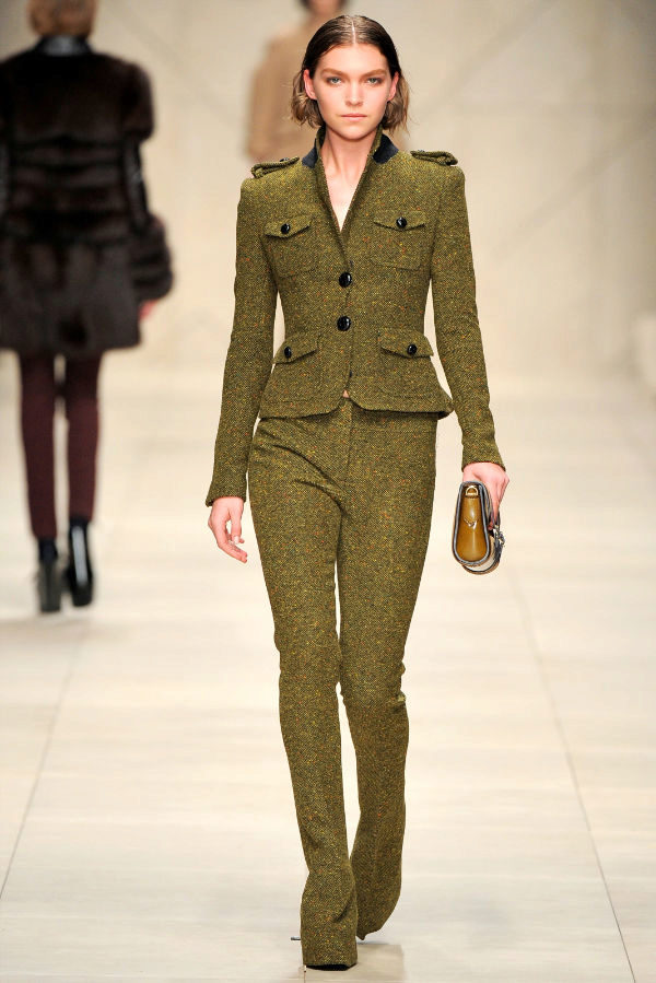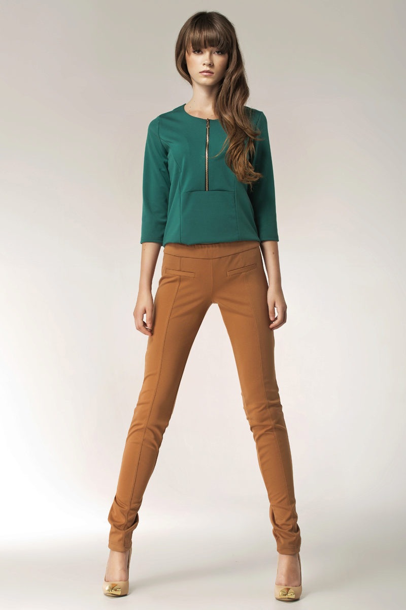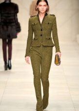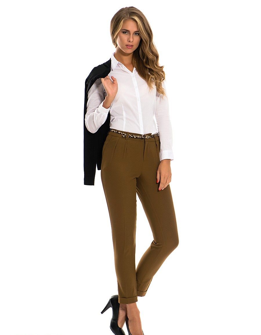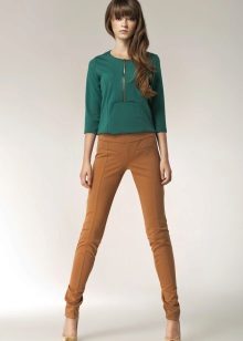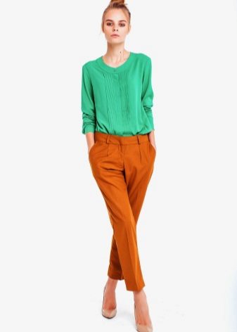 As a rule, trousers sew from cotton fabric or flax. Warmer models are made of wool or tweed. Pants of this color are suitable for autumn, but can be worn in any other season.