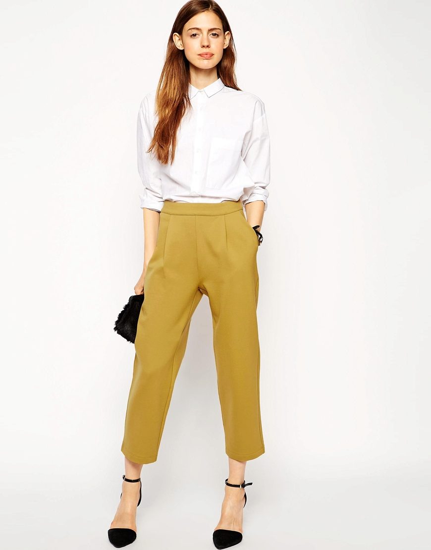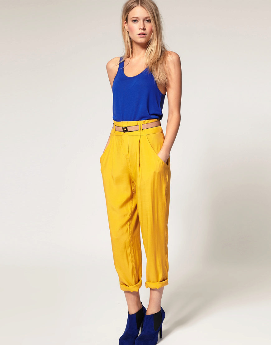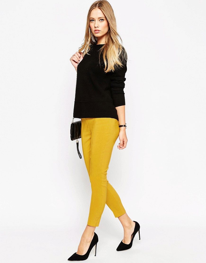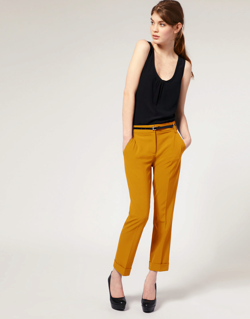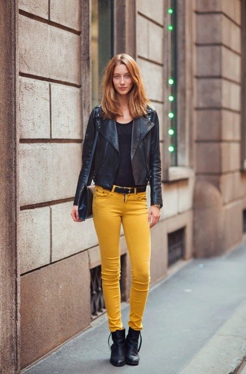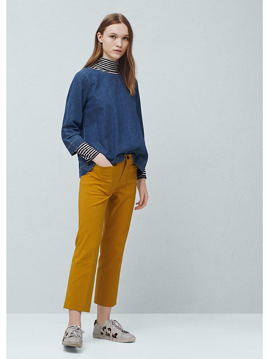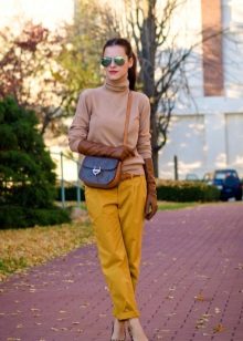 - Sporty look with mustard pants. Cropped straight-leg trousers with a turtleneck and a loose fit denim tunic. Add sneakers color low-key.