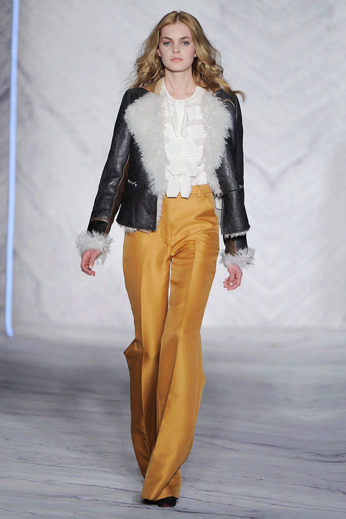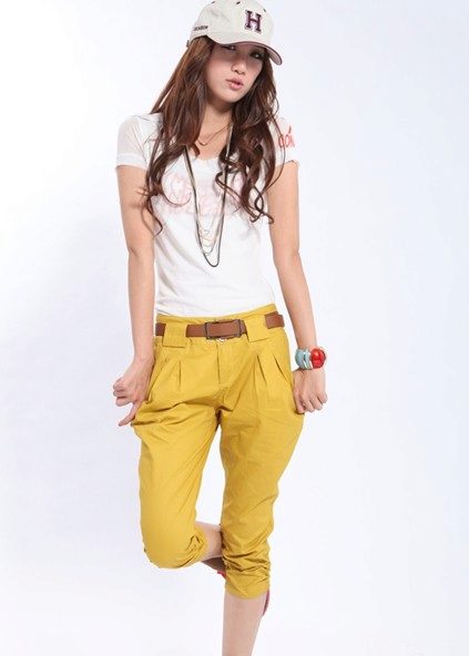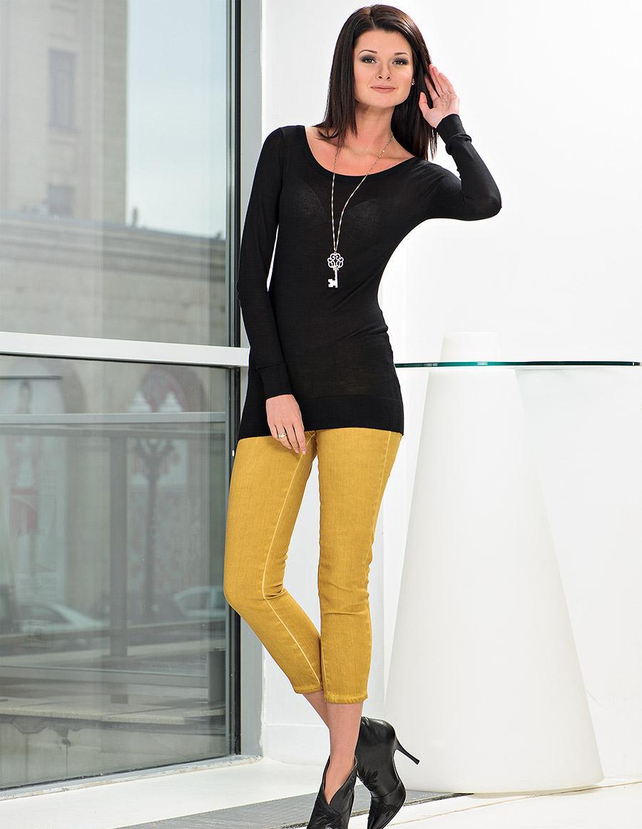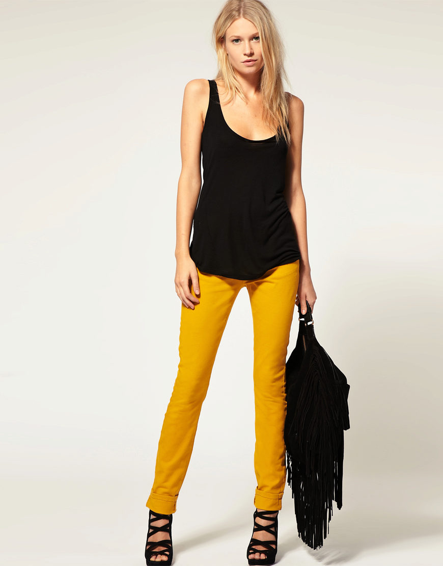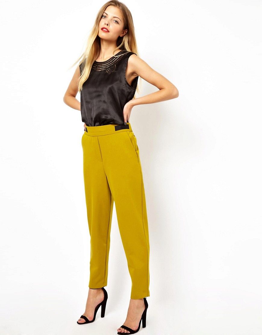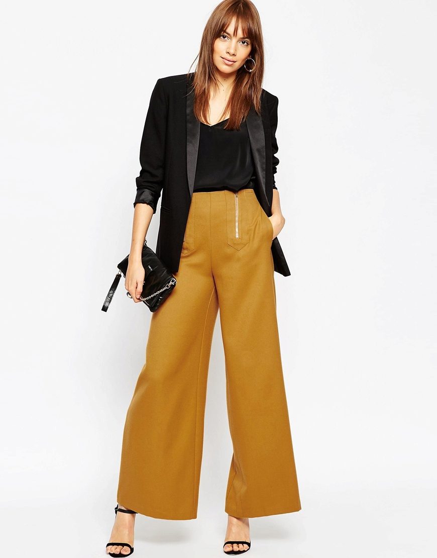- Sporty look with mustard pants. Cropped straight-leg trousers with a turtleneck and a loose fit denim tunic. Add sneakers color low-key.