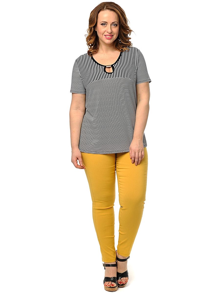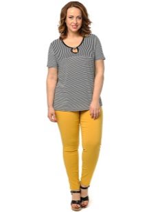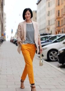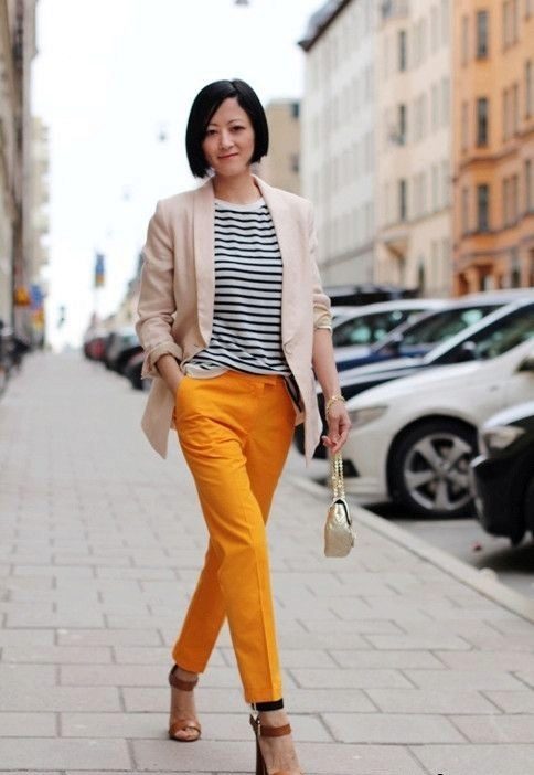 - Mustard pants + striped jacket. Pants of bright mustard color in combination with a black and white striped top. The shoes are black, the bag is in tone with the pants.
