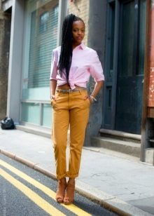 And, of course, just a classic among the mustard-colored trousers are chinos, with a lapel ankle. Freely seated silhouette will help you feel comfortable everywhere.