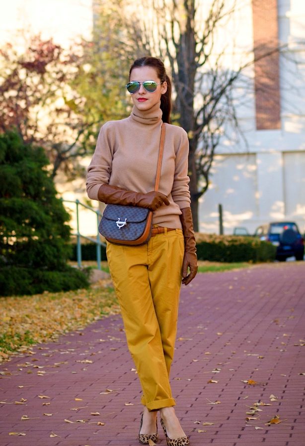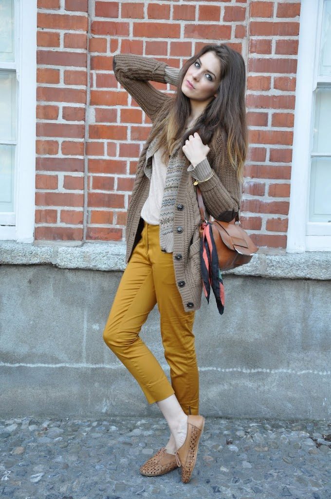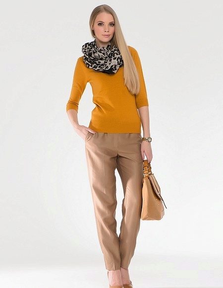 - Mustard pants + beige top and knitted cardigan. This image embodies all of our recommendations. Bag and shoes - brown. Great look for every day.