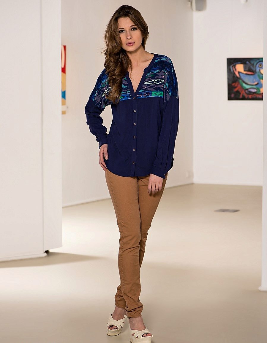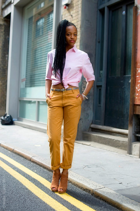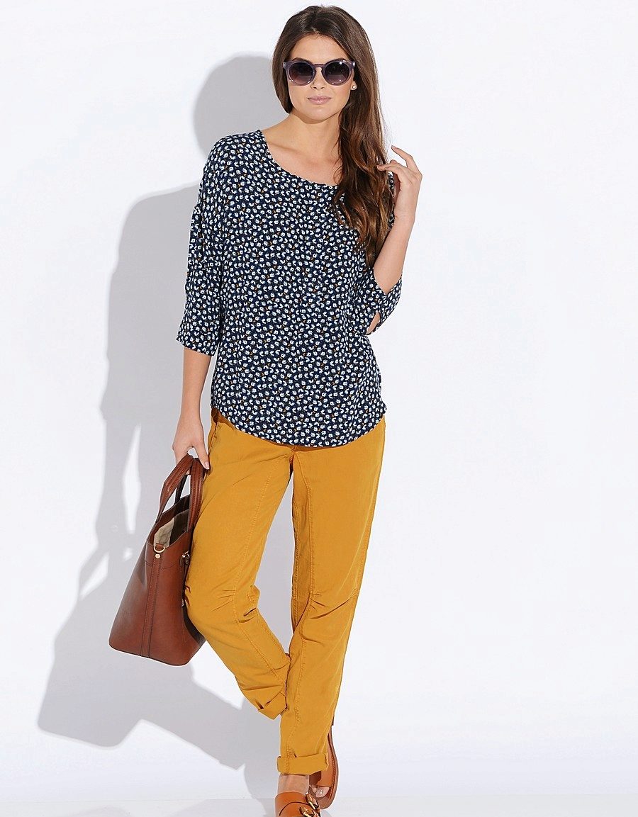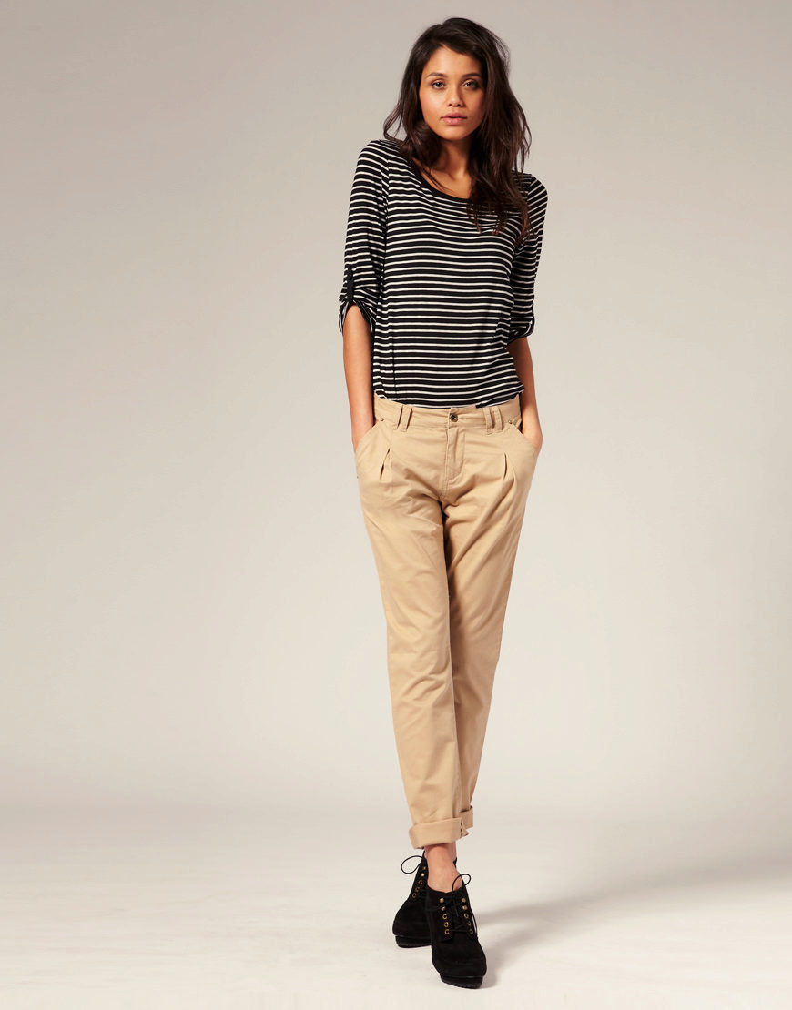 Chinos are perfect for creating an image of sport chic or a simple sport. Pick a jersey or silk top. Flat shoes - loafers, sneakers or slip-ons.