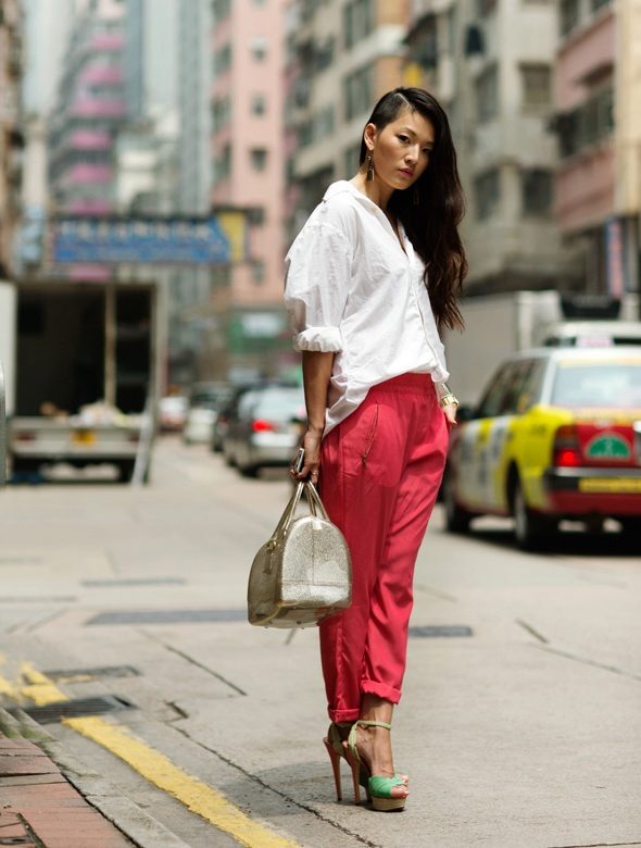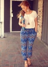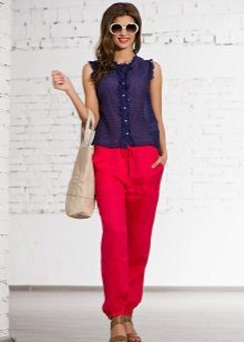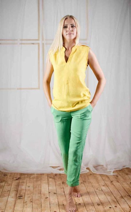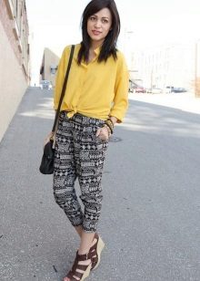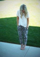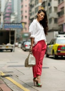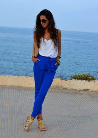 Bananas. The summer model is somewhat reminiscent of chinos, but it is free not only in the hips, but also around the knee. Bananas look good with a narrow waist and broad shoulders, the main thing to emphasize the bends of the waist. They are worn with sneakers, sandals, shoes with heels.