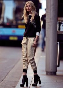 Other styles of trousers, such as chinos or bananas, are worn on an informal basis for walking and going to the movies. From shoes, cotton trousers are combined with absolutely everything depending on their style and model - shoes, sandals, sneakers, slip-ons, loafers, ballet flats, slaps.