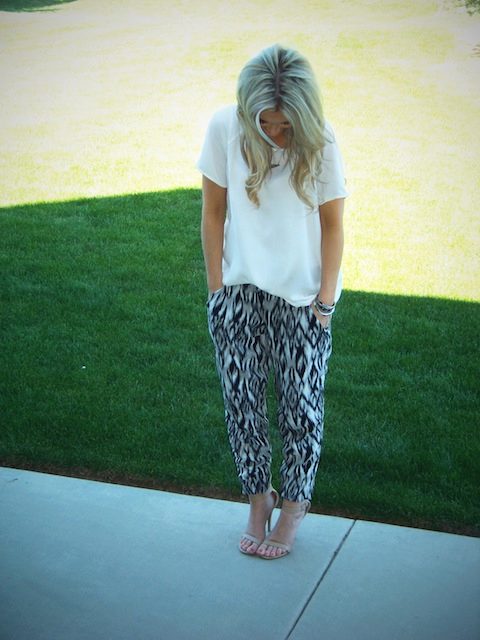 Outfit for walking on the beach, in which the heat is not terrible. Wide cotton pants, flying top well complemented by a wicker bag and an original pendant.