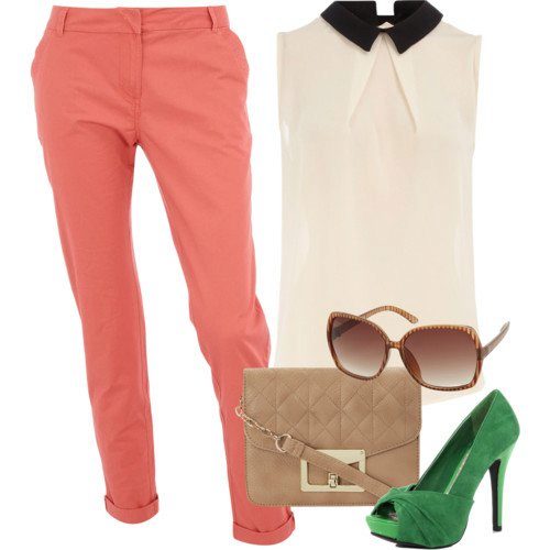 A gentle bow for a date with muted coral-colored trousers is combined with a white blouse and a beige clutch. Green shoes make a bright accent, you can add a small bracelet in shades of green.
