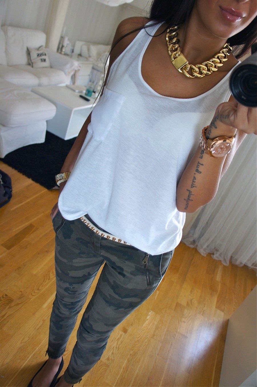 And, finally, an image that will suit everyone and at the same time will be effective in any life situation. So, camouflage trousers of direct cut, white t-shirt, leather jacket of red color, bulk bag and boots or ankle boots on wedge heels. A pair of massive bracelets or a long chain with a pendant will go well with this.