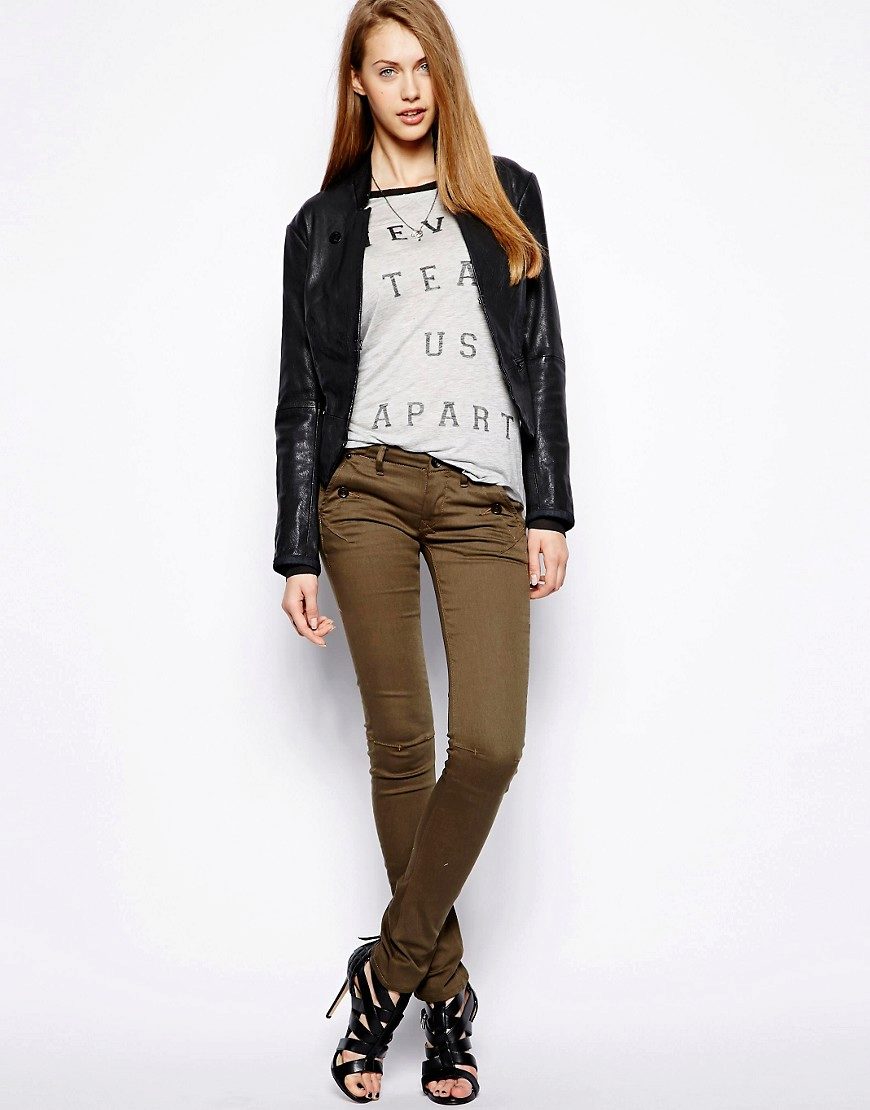 For example, khaki perfectly harmonizes with bright colors, for example, with fuchsia. Such a choice may be very unexpected for others, but it really works and looks very stylish. A jacket or a bomber jacket can be a contrasting “spot”, and a T-shirt, shoes and accessories should be in calm tones. If you want a more relaxed look, then pay attention to black leather jackets.