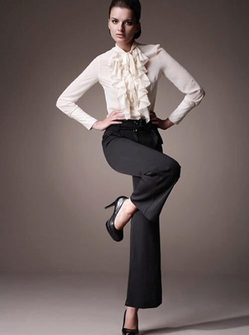 The most classic option - a white shirt and black dress pants - can be quite spectacular. The blouse can be made of chiffon and decorated with jabot, tucked into straight pants with high seating. This outfit emphasizes the beautiful figure of a woman, and her height will be slightly higher with the help of black patent leather shoes. There is no need for accessories, because ruffles on a blouse create complexity and romance to this image.