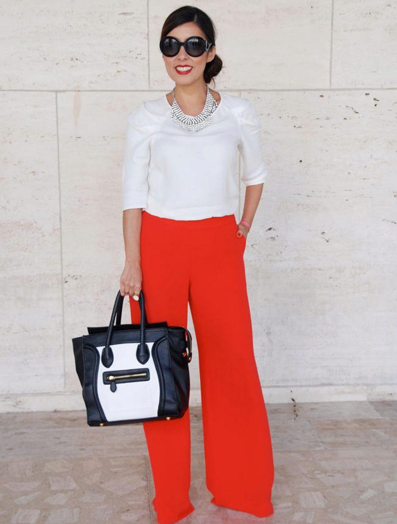 Finally, an example of the use of bright trousers, again in combination with a snow-white shirt. Coral, pink shades are perfect for owners of dark skin, and beige-gray shoes, bag and belt will help to complete the image. This outfit is suitable for going to the cinema, walking and official meetings.