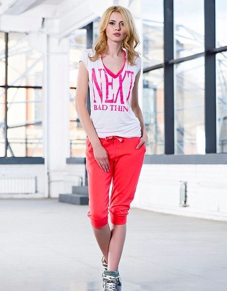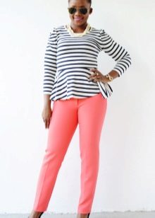 Narrowed and cropped coral pants will look good with spacious T-shirts and tunics with a bat sleeve. Wide coral pants, it is desirable to balance a narrow-fitting top. The same sports jerseys and t-shirts are best combined with sports pants of coral color. Do not neglect the combination of coral trousers with jeans.