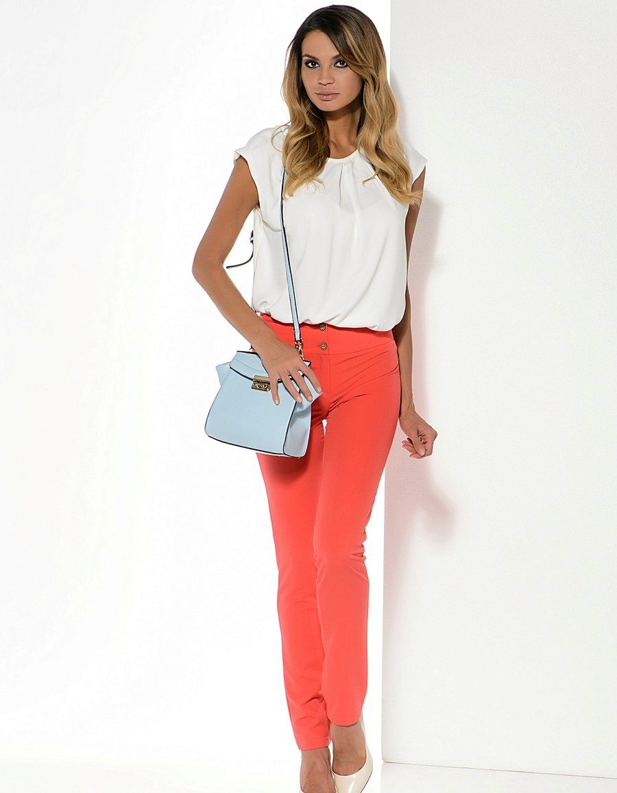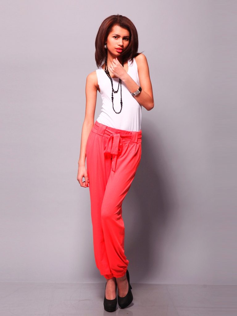Correctly chosen style of coral trousers will help to hide from prying eyes all the small imperfections of the figure. Skinny coral pants, leggings, leggings and “breeches” will suit only rather slim and tall girls and women.