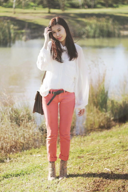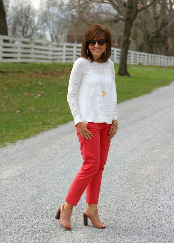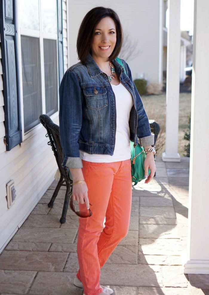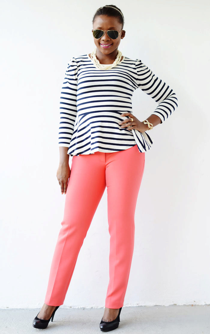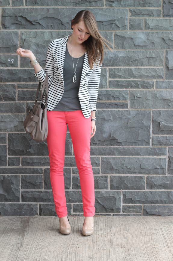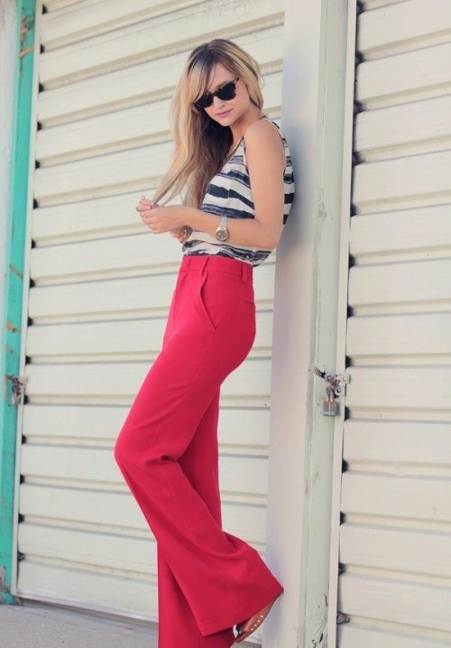 In that case, if you are impressed by the marine style, you can wear coral trousers with riding in a fashionable strip.