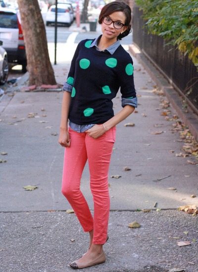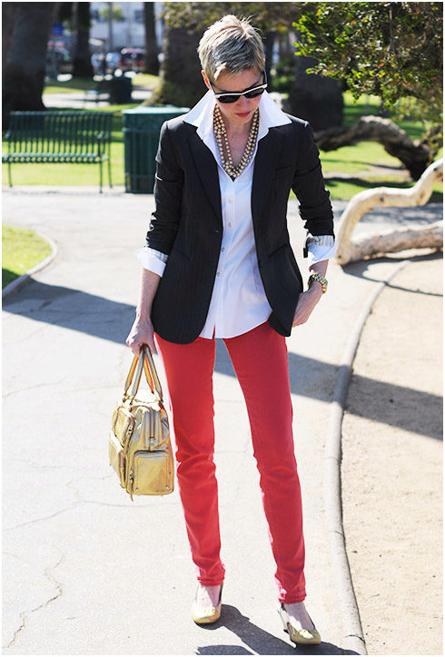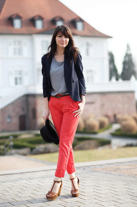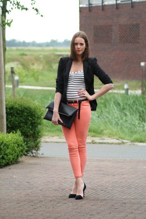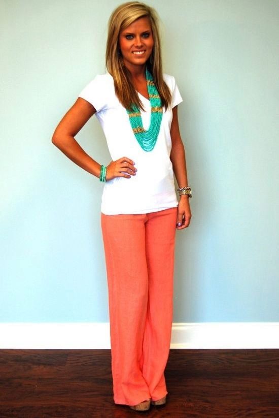 Coral pants will be interesting to look with white or black accessories, as well as in combination with all shades of gold. More coral things look great with turquoise ornaments.