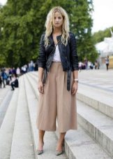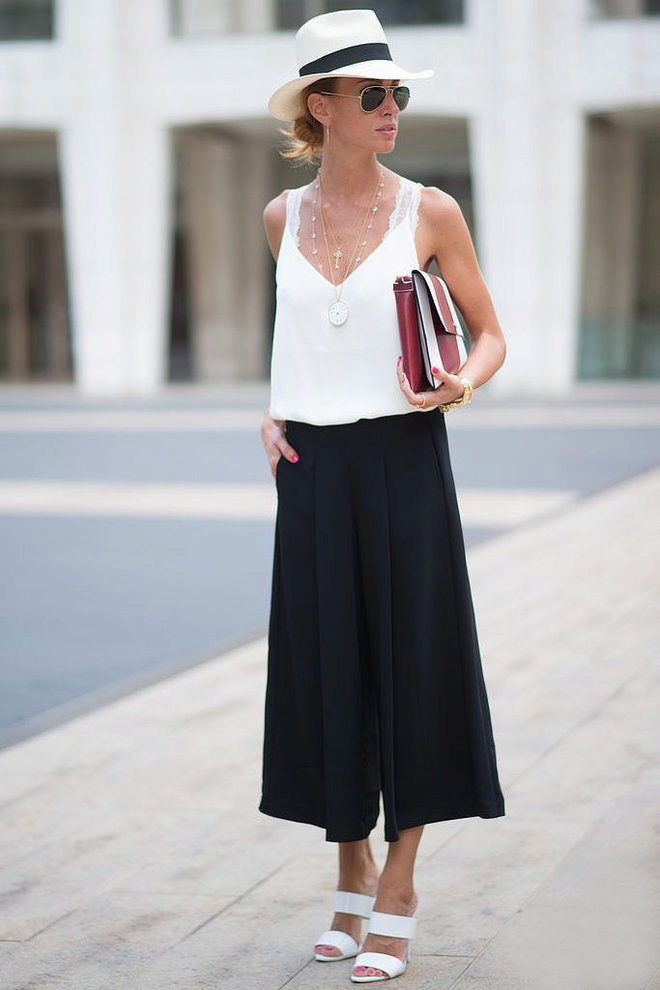 Culottes. The width of the leg varies from simply wide to very wide. These pants can be as far as mid-calf, and just above the ankle. But the optimal model that is suitable for almost everyone is moderately wide trousers (they are sometimes called skirt-trousers) with a length slightly below the knee.
