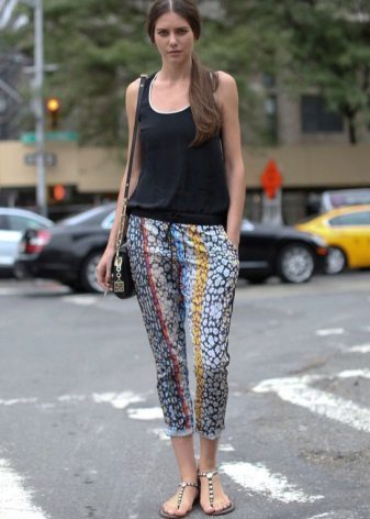 Capri. This model has a straight cut and slightly narrowed down leg. Their width is quite narrow, but not tight. They are only slightly adjacent to the legs. Often made of dense fabrics and have arrows.