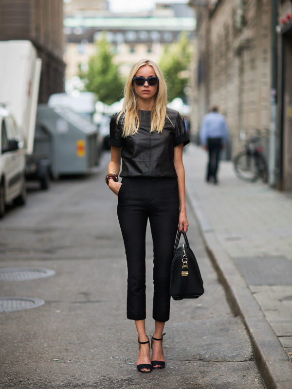 Lady in Black. Cropped trousers with a slightly higher waistline, a translucent geometric blouse tucked into the trousers, an elongated jacket, stylish sandals and a strict roomy bag. The image is completed by a slim, elegant strap. This outfit will have the way both in the office and on a long trip.