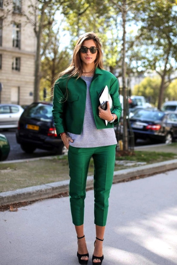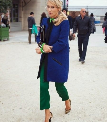Do not be afraid of bright colors! Emerald trousers, a cornflower-blue coat and golden pumps are a wonderful ensemble designed to color gray autumn days. Complete the image of a simple shirt to match the pants.