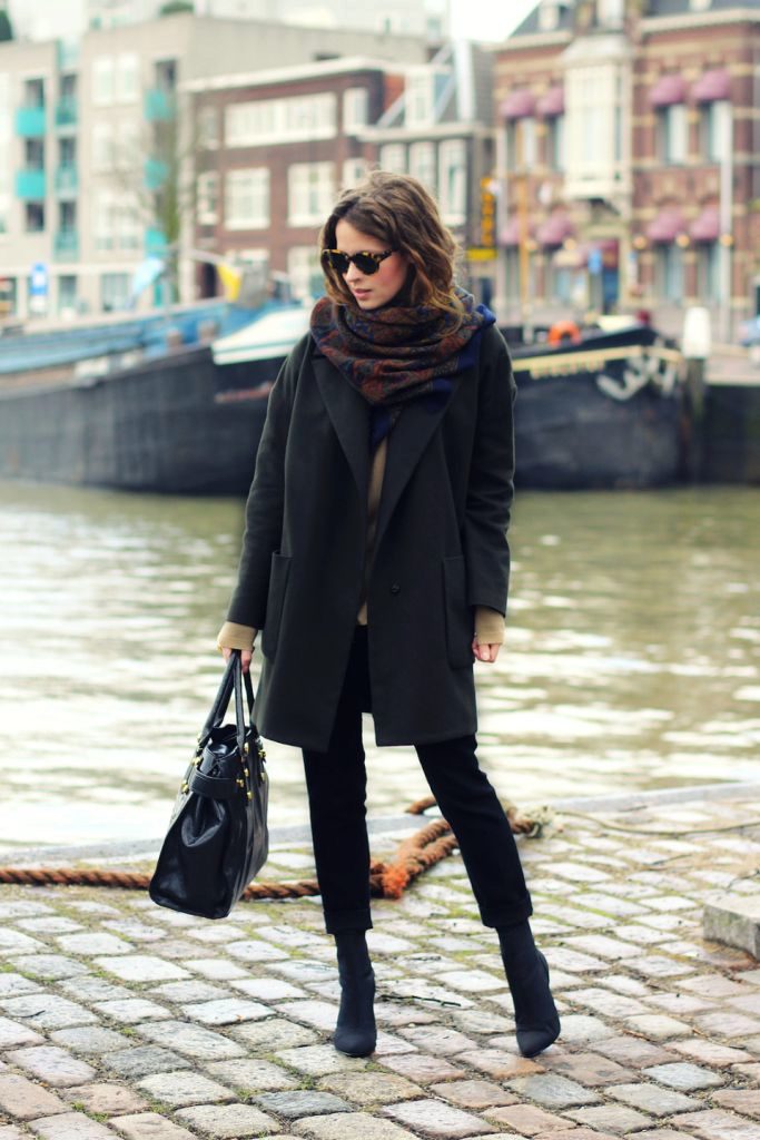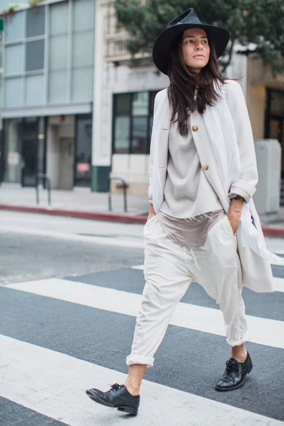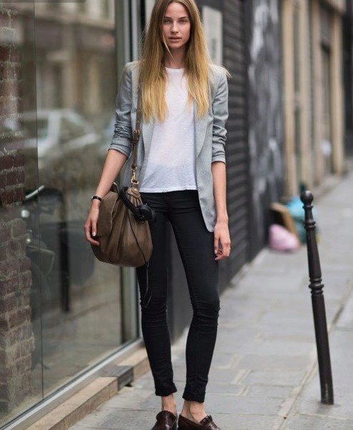 Typical modern urban girl: black ankle pants, plain white T-shirt and minimalistic gray jacket. Elegant loafers and a massive bag complete the look.