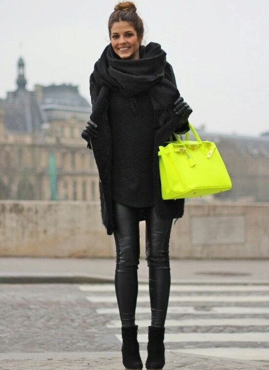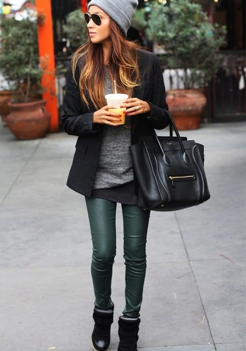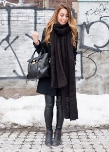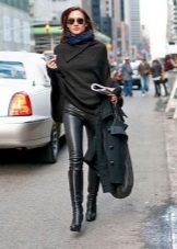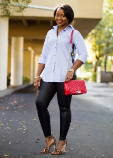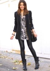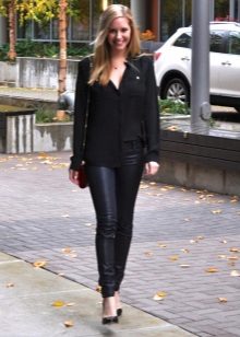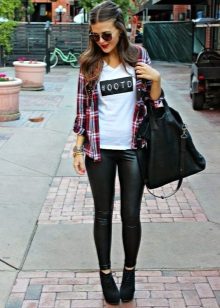 Matte or semi-matte leggings - accent option, independent. It is better to pick up some very soft top, for example, a silk blouse, angora sweater. Clothes made of cotton or denim with leggings are a great democratic combination for a big city.