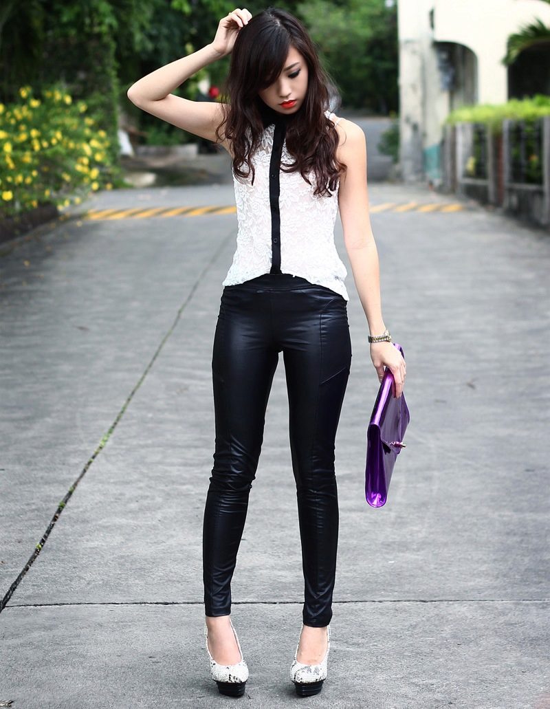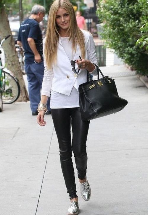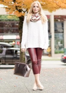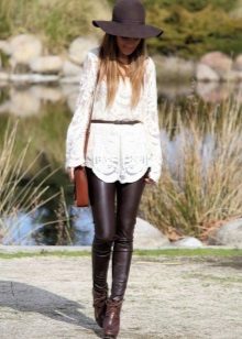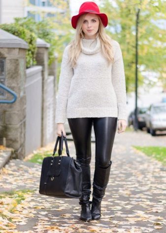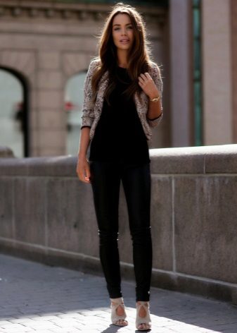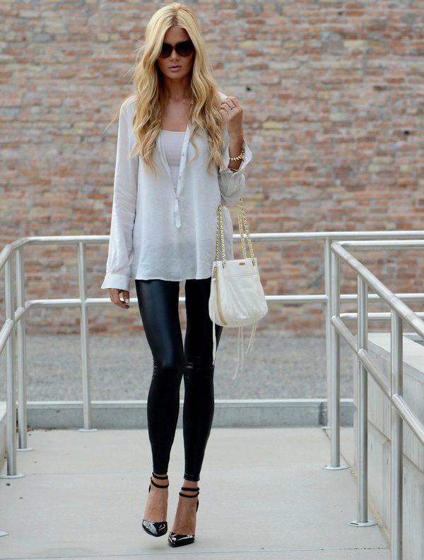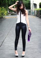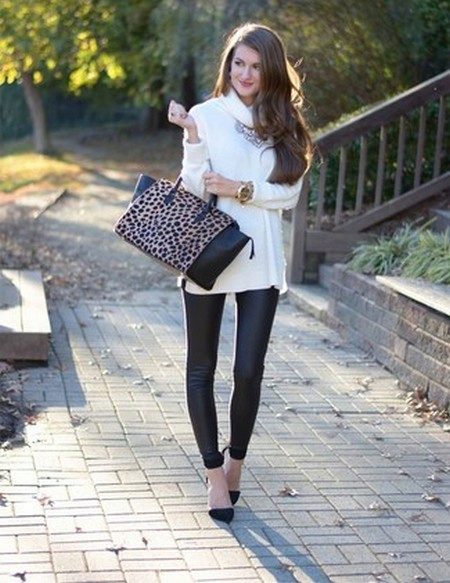 Leather leggings look good with leopard print. For white leggings fit white top. It is worth remembering how the textures are combined: it is better to muffle shiny models with frosted cotton, matte ones - decorate with silk or satin.