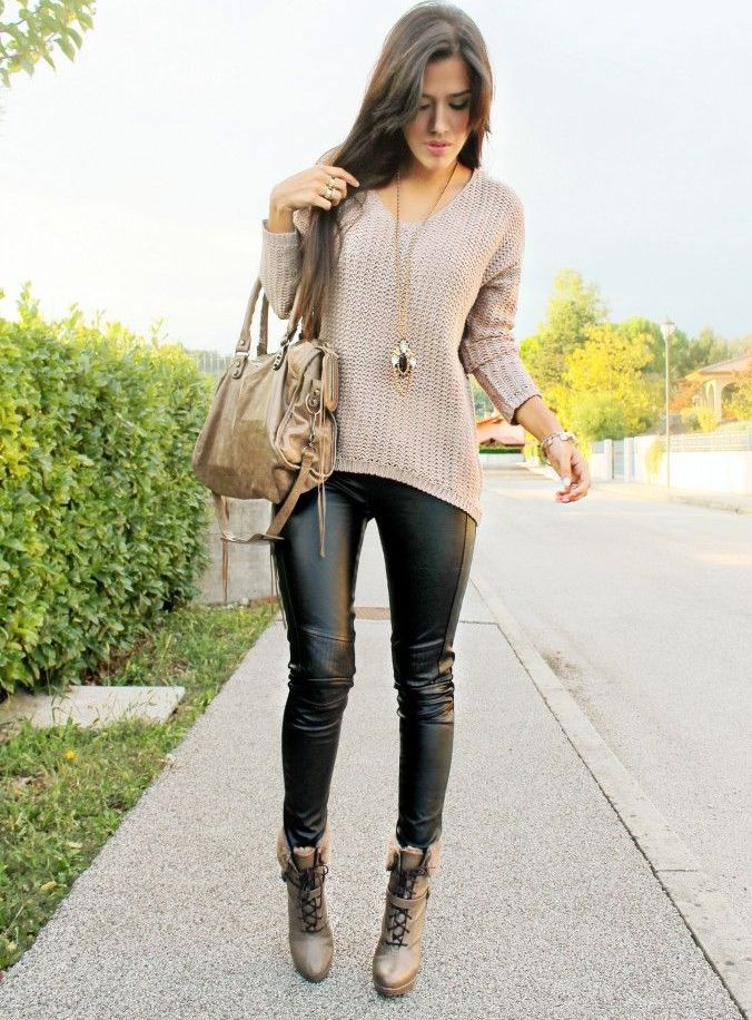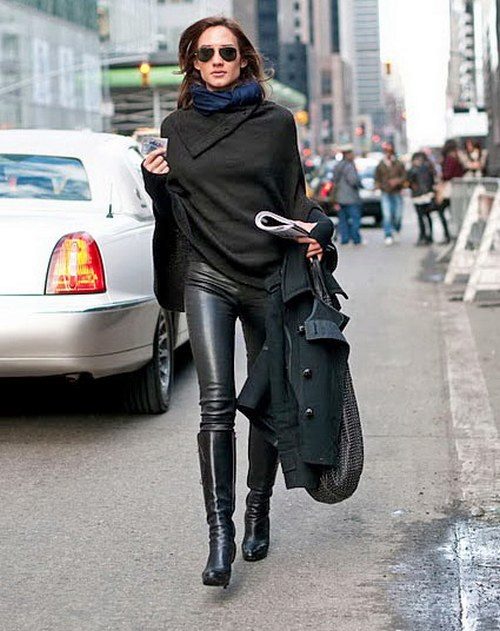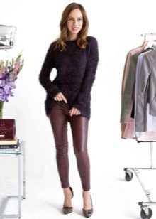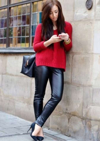 Modern leather leggings are very comfortable, versatile and beautiful. They are made of thick knitwear, which nicely pulls down the figure, if you choose the right size. There are different leather leggings: matte, semi-matte, embossed, shiny.