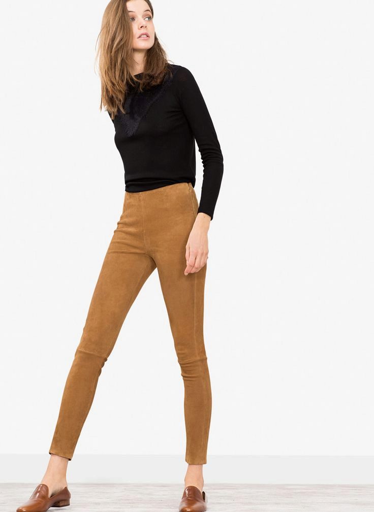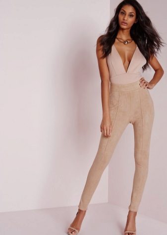 Suede pants - a very interesting option, and not in black. Dusty pink, gray, beige and other pastel shades are the best colors for such clothes. However, there is also a minus in suede leggings - they will only suit owners of slender and beautiful legs, as they emphasize the shortcomings.