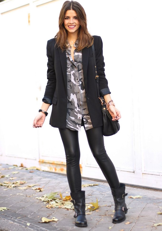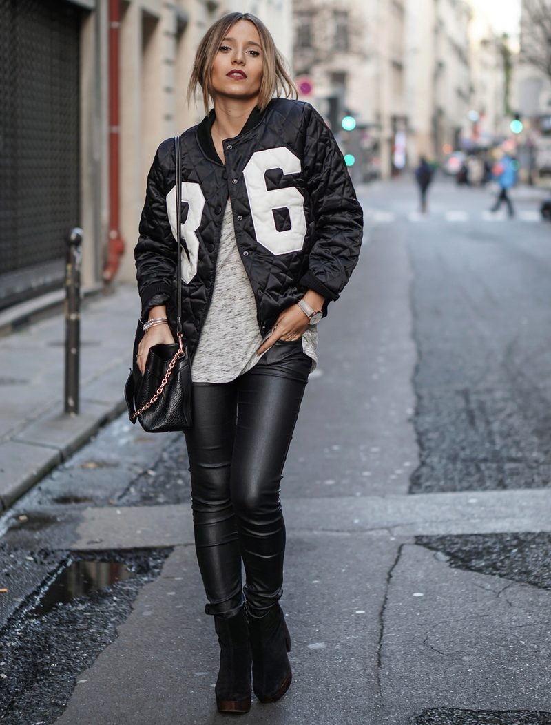 Option for practical girls: leather leggings, suede shoes, loose T-shirt, jacket.