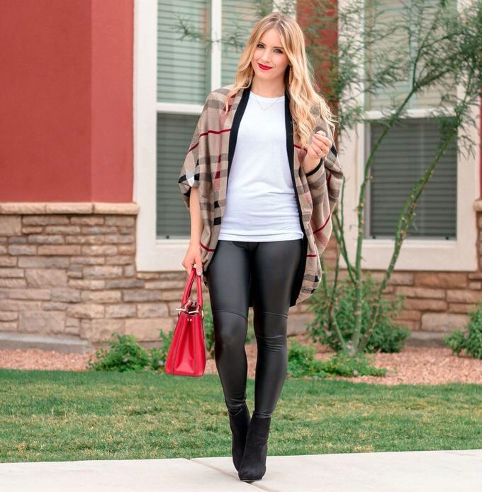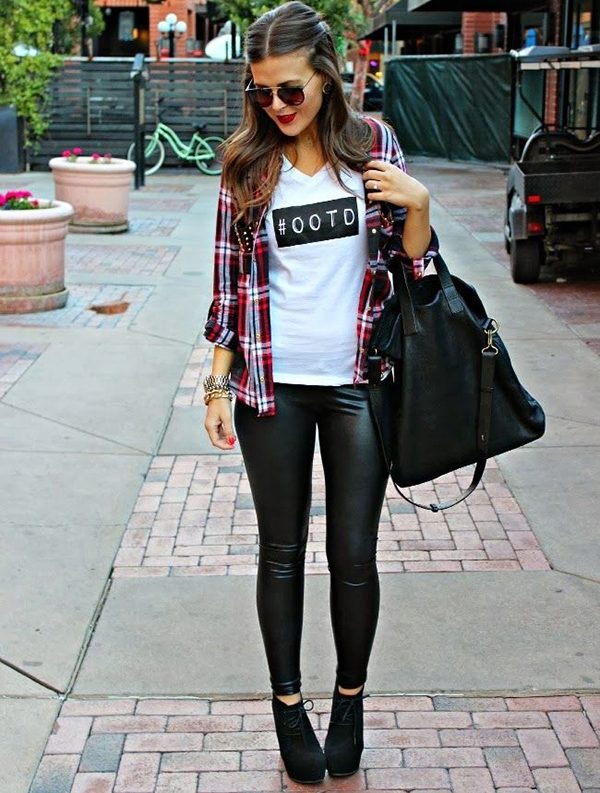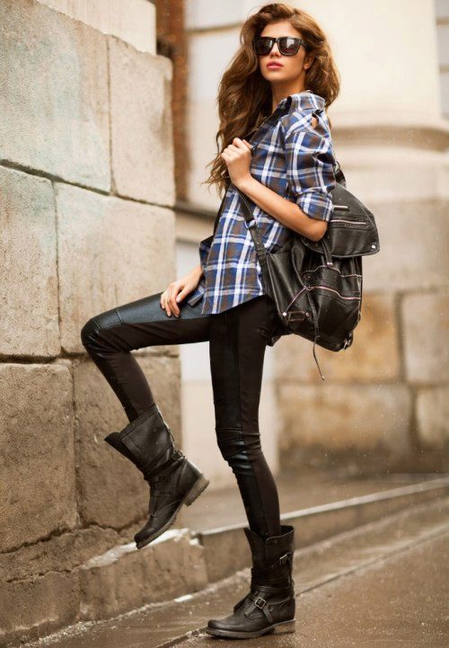 A great option for every day: coarse shoes, leggings with leather semi-matte inserts, cotton check shirt, a comfortable backpack.