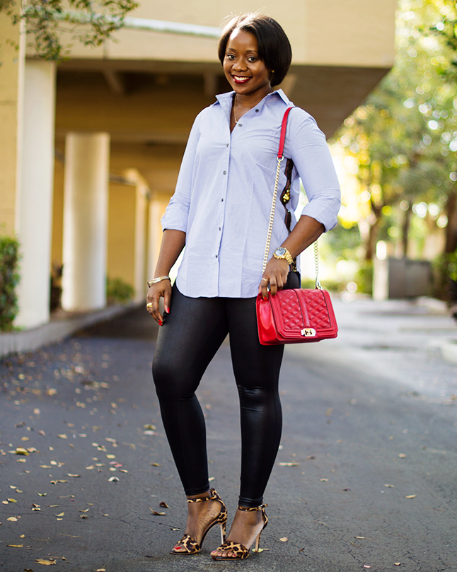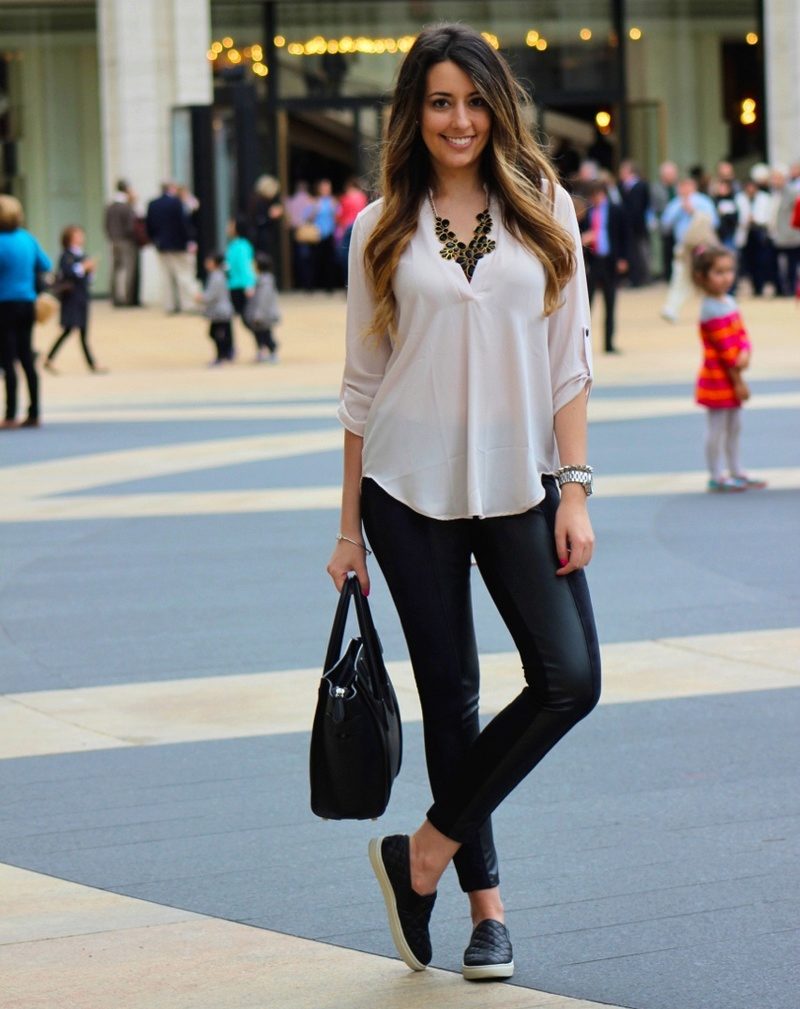 However, matte or semi-matte leggings and plain leather shoes are a viable option.
