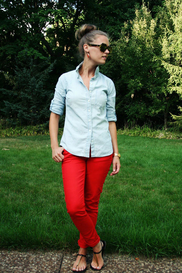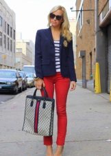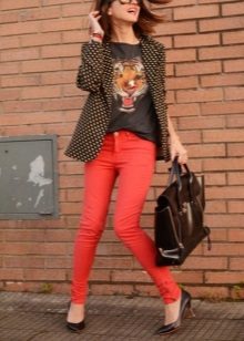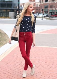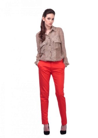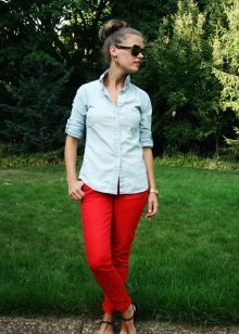 Do not be afraid of red pants, they are in combination with blue denim shirts, chiffon blouses with floral or animal prints and many other items of clothing are able to create relevant and trendy images.