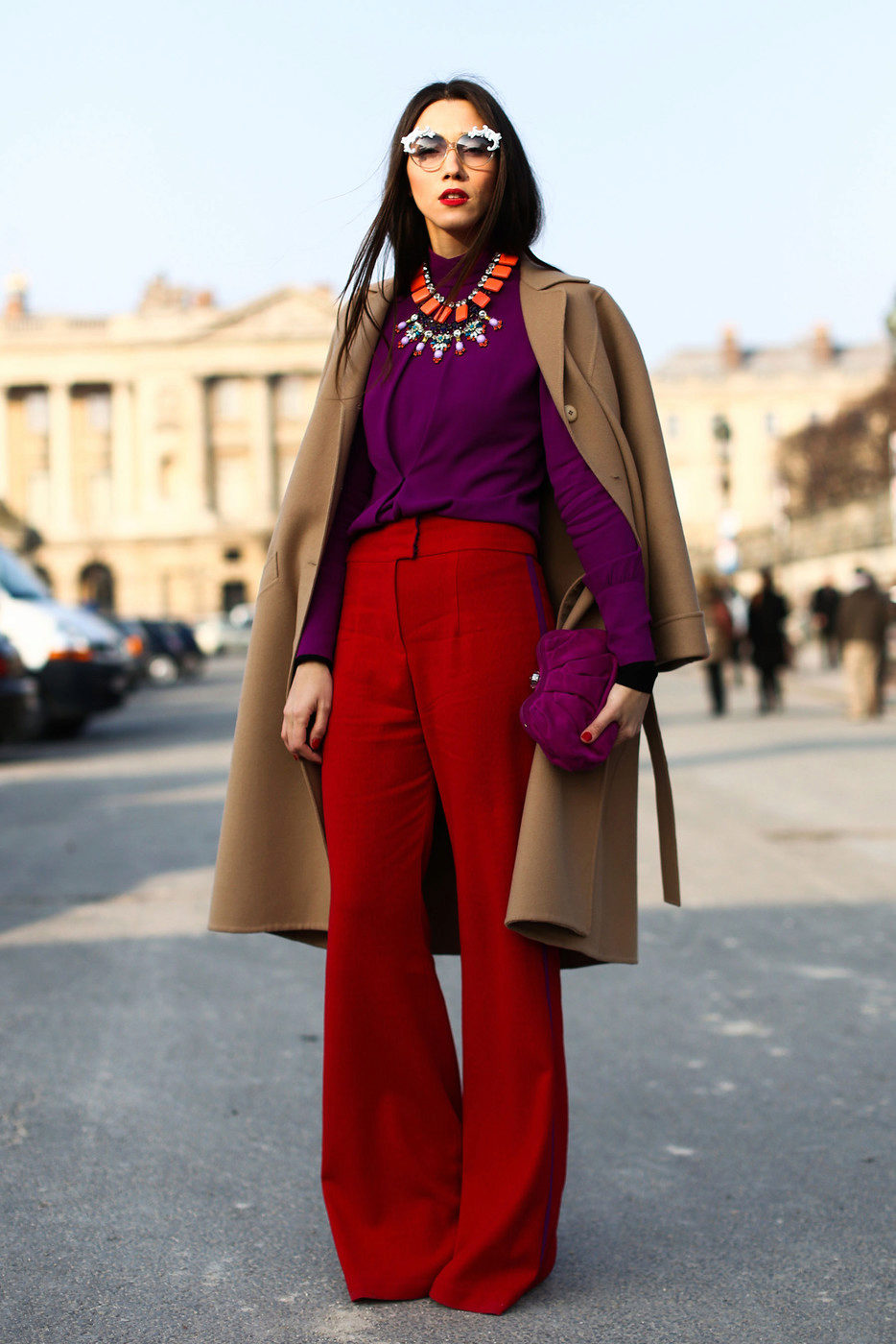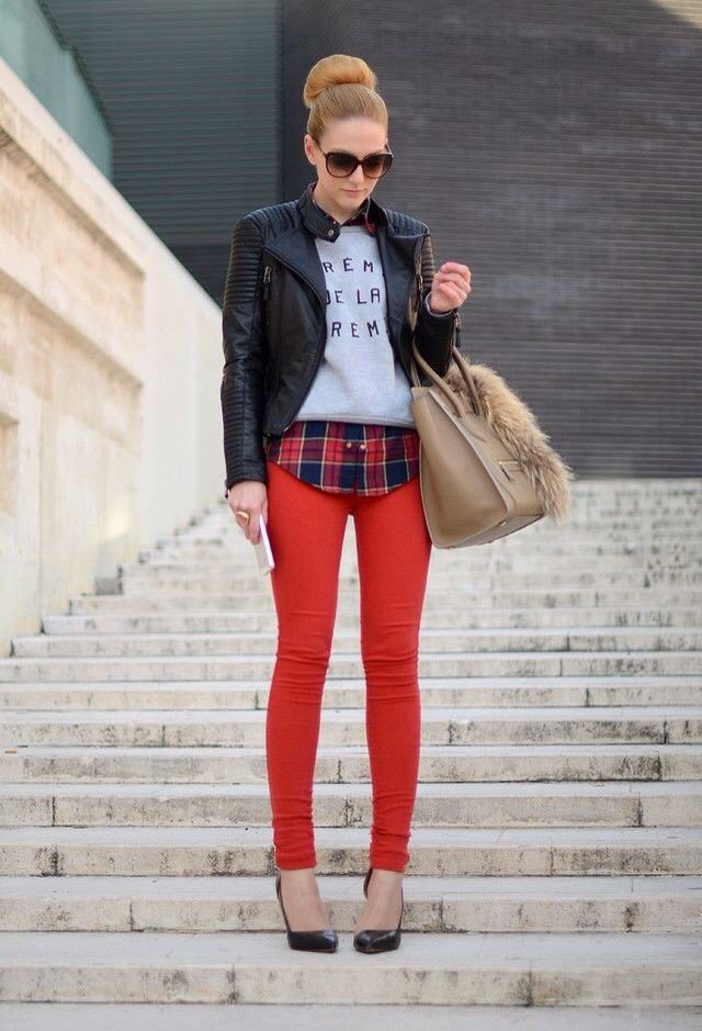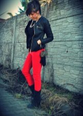 A suede leather jacket or leather jacket, ankle boots or boots, a sand coat or a beige parka coat — red pants will look great in this tandem.