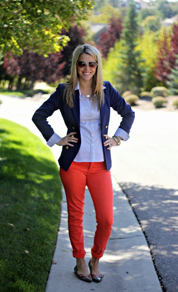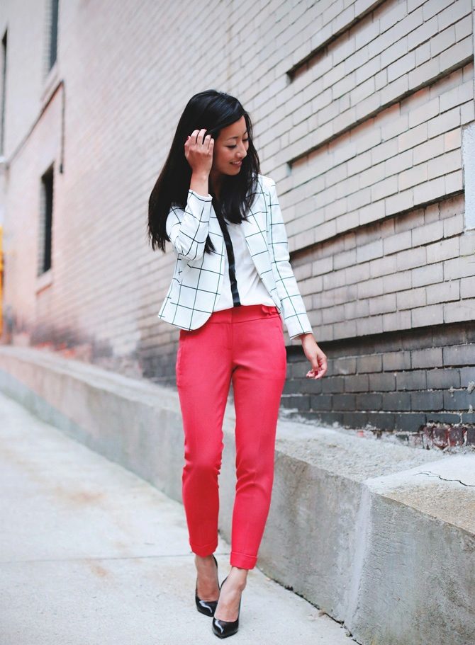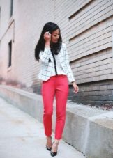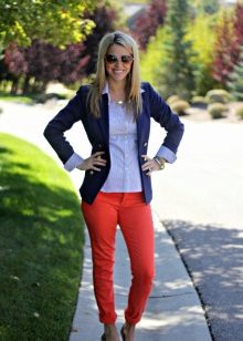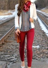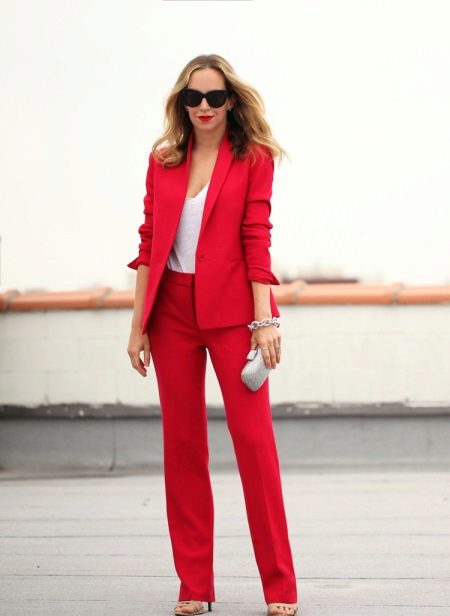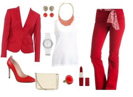 Offices dictate a rigid framework for the appearance of employees. But women of fashion who are not afraid to take risks, always manage to look bright and not boring. This helps them red pants. A white shirt, jacket or gray cardigan, boat shoes and bright trousers fit absolutely into any dress code. An office image can optionally be supplemented with accessories - strict, but elegant, in harmony with each other in color, for example, a set of silver jewelry.