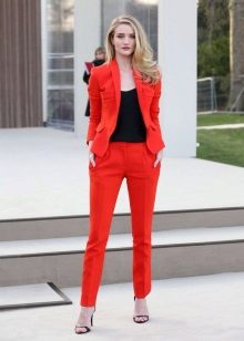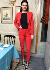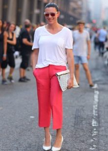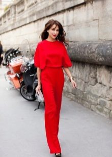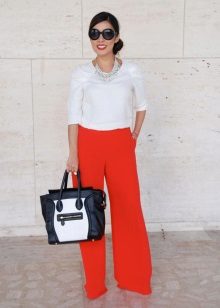 For the most daring beauties. An absolutely red trouser outfit is combined with beige pumps and a white T-shirt, the minimum number of accessories, but it looks so elegant and refined.