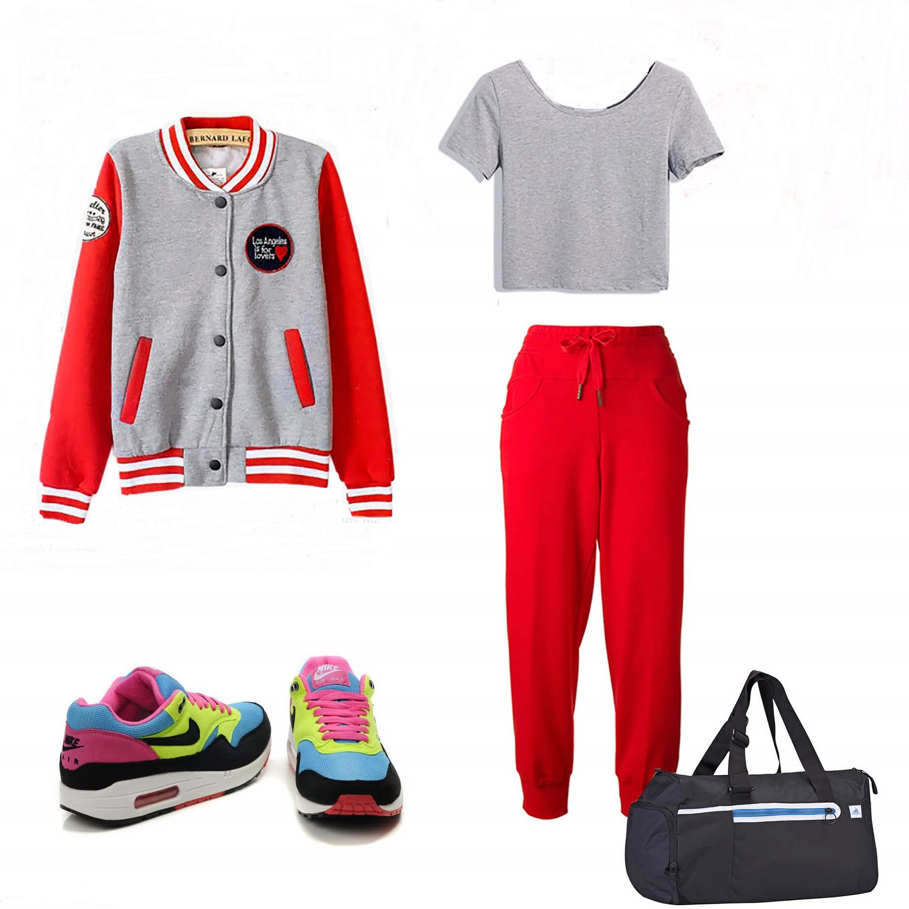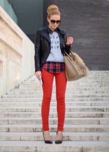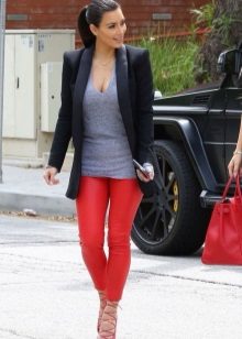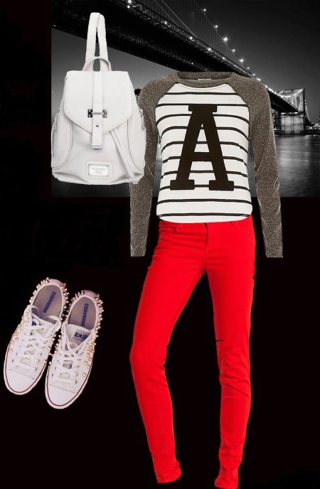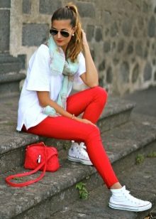 Do not forget about the sport, there, too, can be fashionable. This will help red sweatpants. They are loose, made of nice knitted fabric. They are complemented by a simple gray T-shirt and bright sneakers. In such a dress, it is not a shame to go for a run in the park or start visiting a fitness club.