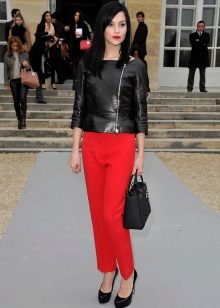 Club fashion is always bright, catchy, not standard. Here fit tight, tight red pants, an unusual contrasting jacket with a basky and open shoulders, a black clutch and the same color of shoes on a dizzying wedge. This output will be remembered by others for a long time.