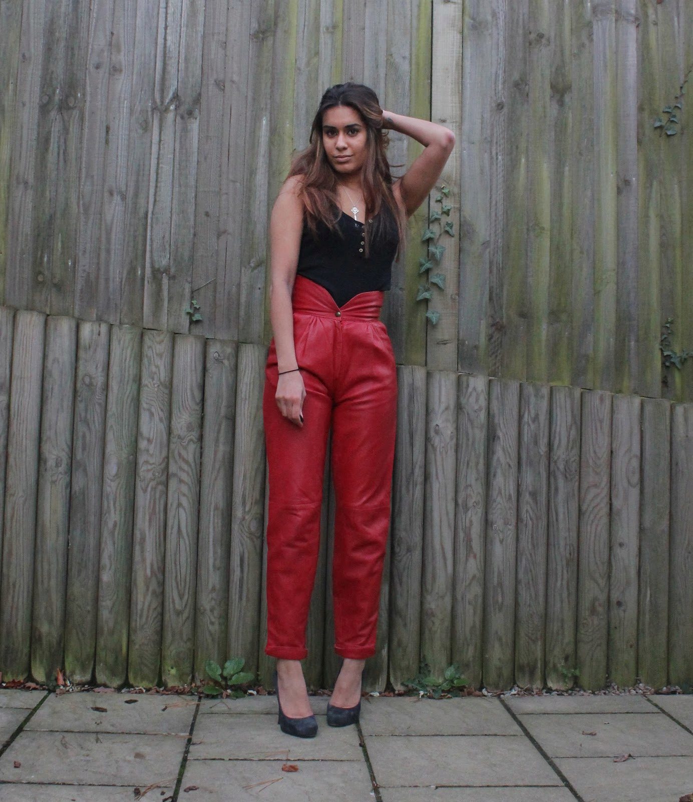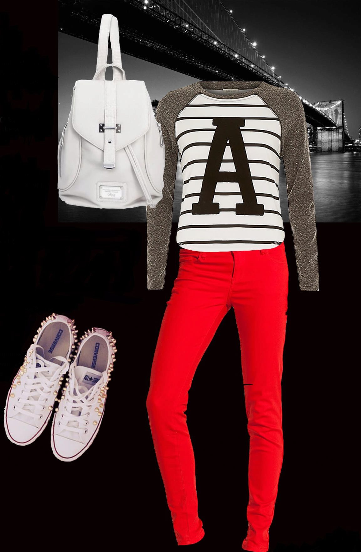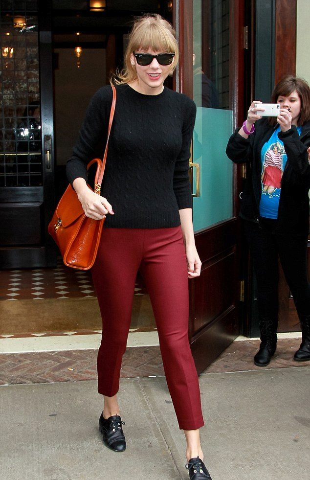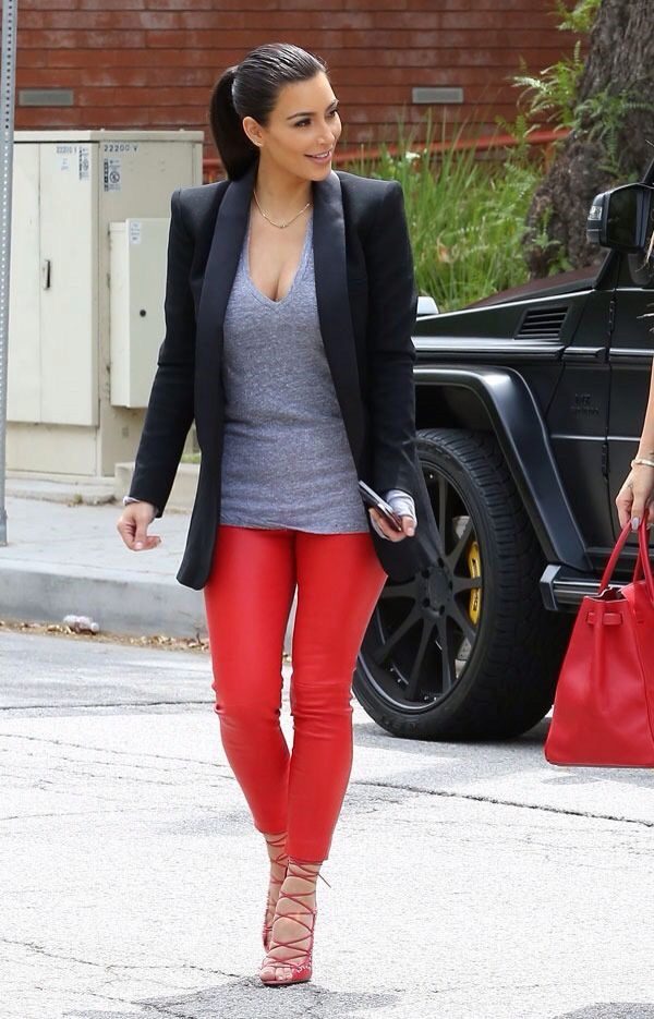 Red pants are perfect for an inverted triangle. Black top perfectly complement this ensemble.