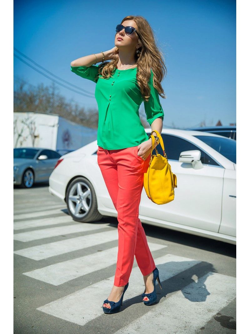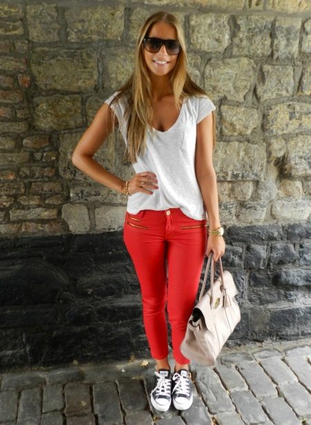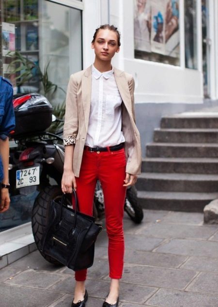 Red pants are perfectly combined with the wardrobe items of white, black, beige, sand, gray shades. These colors are called neutral, they perfectly shade a bright red color and complement it. To create a fashionable look, it is not necessary to limit yourself to the shades listed above; in summer, bright colors are popular - from pink to emerald green.