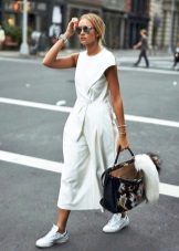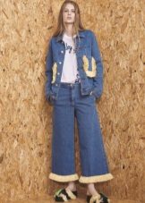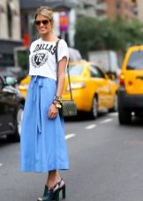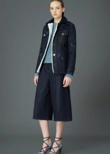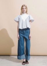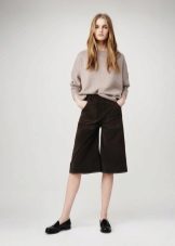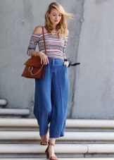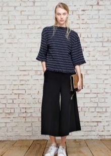 In everyday life, jokes can be combined with your favorite, practical clothing - T-shirts, short tops, shirts, sweaters and turtlenecks. All these things will look great culottes, stitched from democratic materials such as denim, velor or tight knitwear.