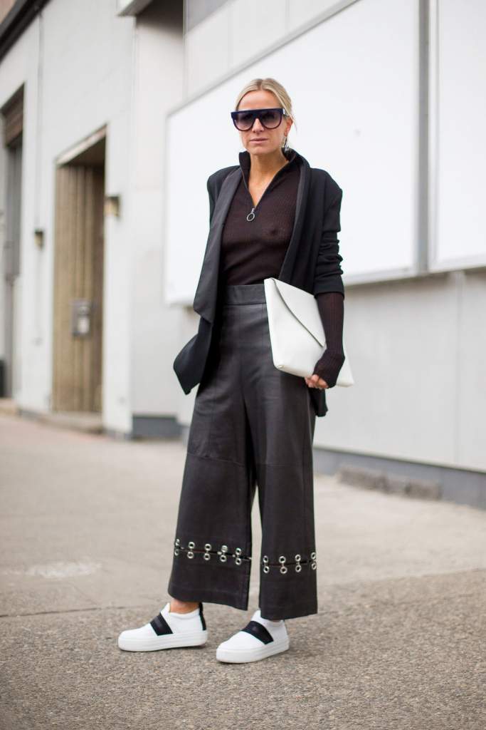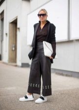 Those who are not afraid that fashionable culottes visually make them a little lower, stylists recommend wearing such pants with comfortable sneakers or slippers, heels, narrow, high boots (in this case, the legs of the leg will cover part of the tops), various shoes — oxfords, loafers, gladiator sandals, etc.
