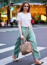 - For study: elongated mint culottes, a white blouse with a short sleeve, light ballet flats and a bag of the same color.