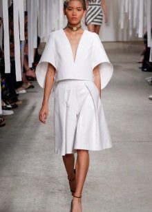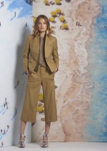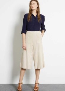 Outwardly, they resemble something between a short wide pants and a straight skirt. These are usually pants with a high or medium fit and flared leg length just below the knees. However, the length of the legs can vary, as well as the fabric from which the culottes are sewn.