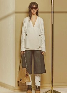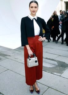 Since the pants themselves are rather voluminous, the bags for them usually choose small but roomy ones. This may be an envelope bag, a trapezoid, a bag, etc. Both bags on a long strap and models with a handle are well combined with culottes.