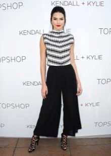 - Kendall Jenner in black culottes, a black and white blouse with a geometric pattern and black sandals with a lot of thin straps.