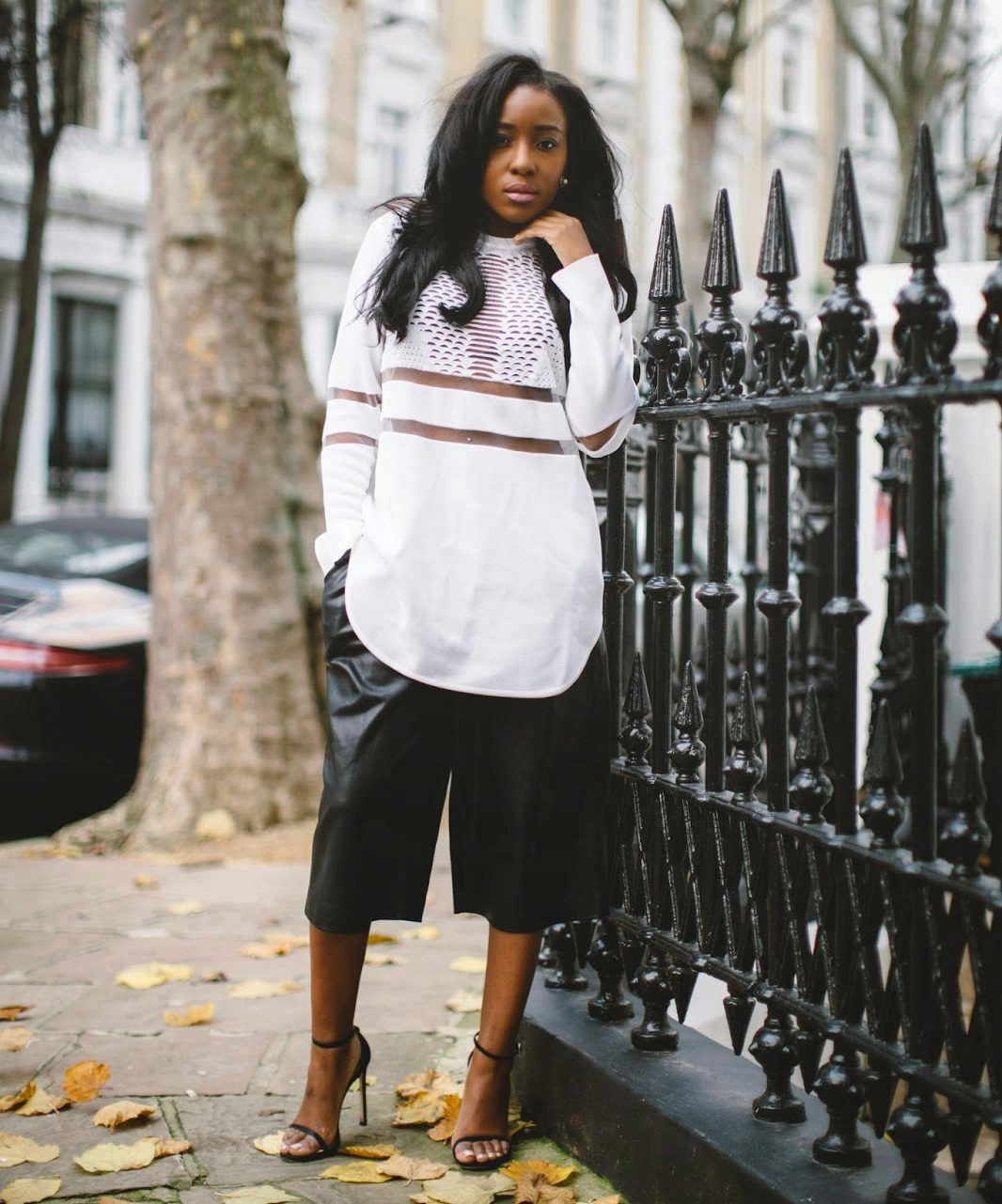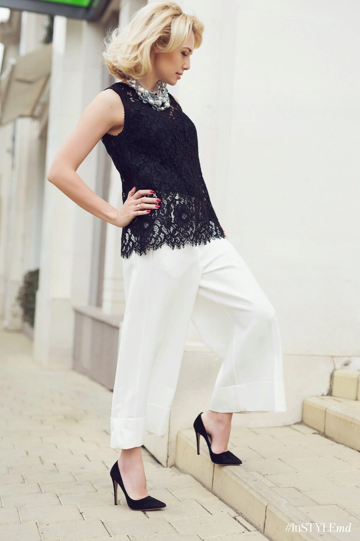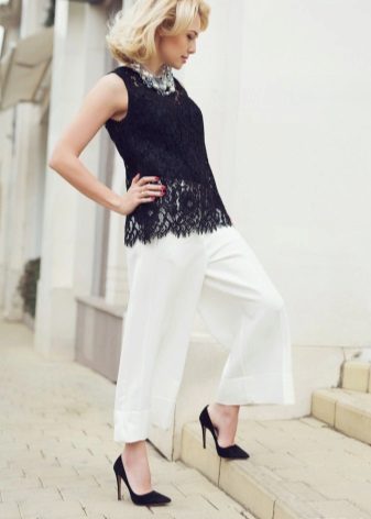 - On a date: white kyulots in combination with a lace black sleeveless top, black classic pumps and a massive necklace.