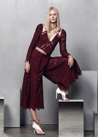 - For the release: openwork set of deep wine shade, consisting of perforated culottes and a sexy top with long sleeves.