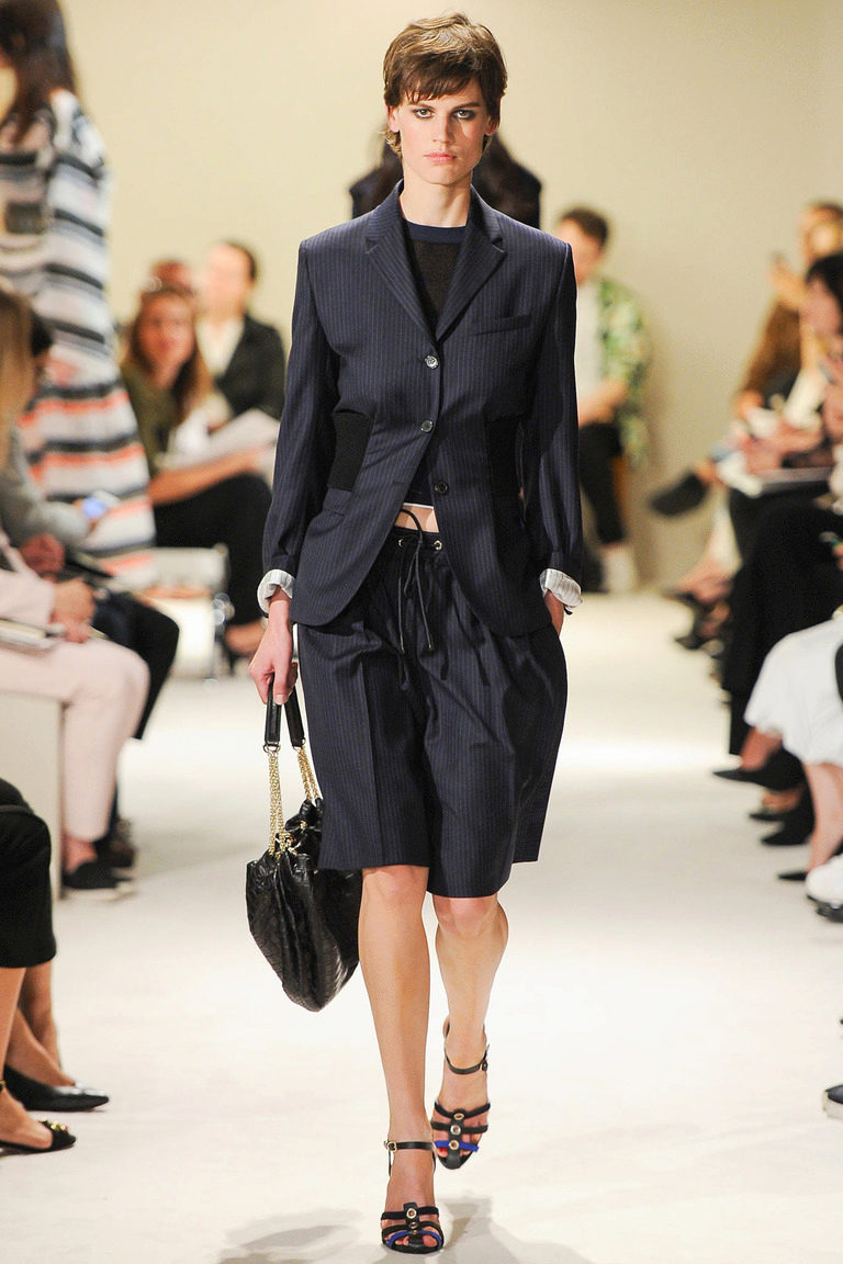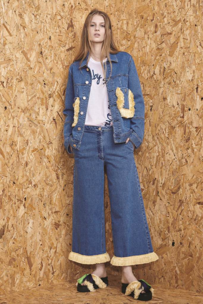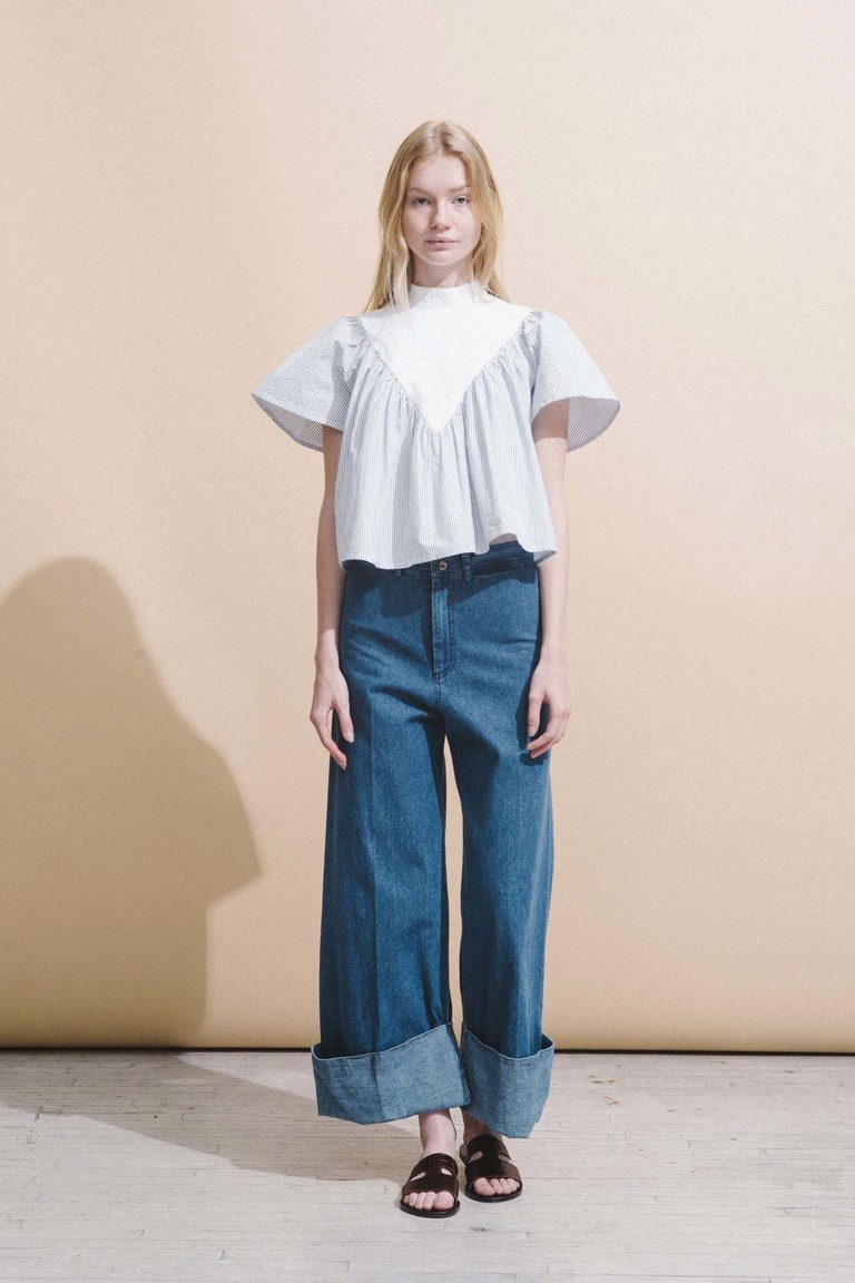 - Shopping: blue denim culottes, a striped top with a long sleeve, opening shoulders, a roomy brown bag and tonal sandals.