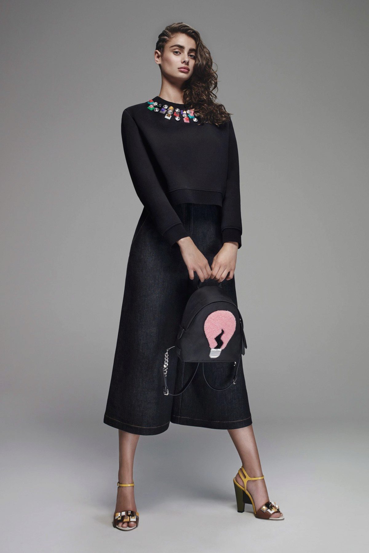 - In the cinema: light denim culottes, a short print shirt, green sandals with high heels and a miniature green handbag.