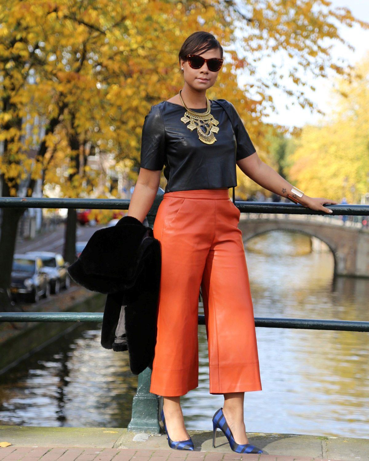 - A little playful: navy culottes with arrows combined with a polka dot shirt and blue shoes.